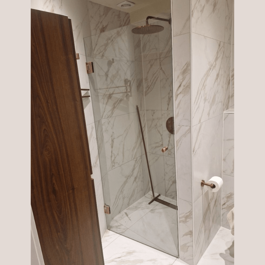 Bestel in een paar klikken snel en gemakkelijk deze glazen douchedeur op maat met koperkleurig beslag.