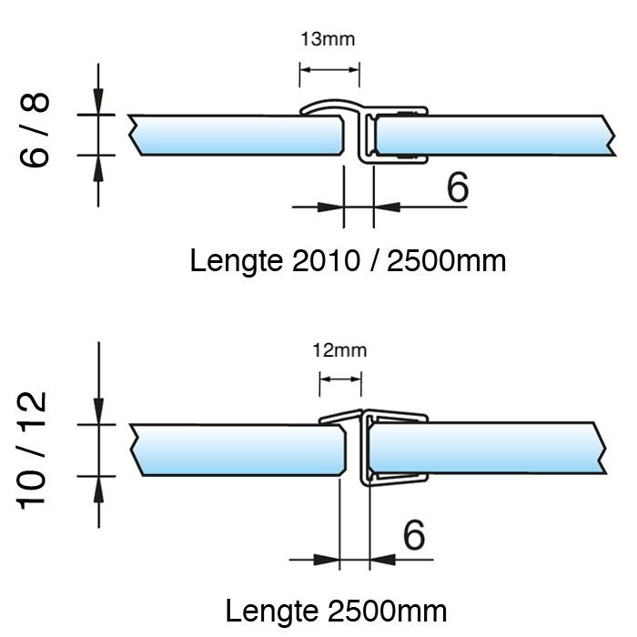 De binnenkant van de strips loopt iets taps toe en klemt hierdoor strak om het glas. Sommige strips zijn geschikt voor 2 glasdiktes. Dit komt omdat aan het einde van de binnenkant 2 kleine uitstekende randjes zitten waar het glas of tussendoor schuift of tegen aan komt. Hierdoor zijn sommige strips geschikt voor 6mm / 8mm, 8mm en 10mm / 12mm glasdikte en kan soms de benodigde speling per glasdikte verschillen. Sommige strips zijn enkel voor 1 glasdikte geschikt, deze beschikken namelijk niet over de uitstekende randjes.