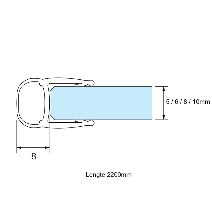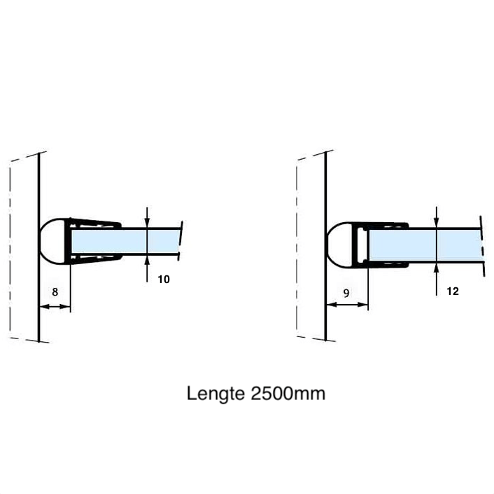 Het deel dat op het glas wordt geschoven is een U welke iets taps toe loopt. Hierdoor klemt deze strak op het glas. Wij leveren strips van verschillende leveranciers waardoor er kleine kunnen verschillen zijn. Sommige strips zijn geschikt voor 1 glasdikte, maar er zijn ook strips die geschikt zijn voor 2 glasdiktes. Wanneer een strip geschikt is voor 2 glasdiktes zoals bijvb. 6mm / 8mm dan zit er in de U van deze strip een uitstekend randje. Glasdikte 6mm schuift hier precies tussendoor en het randje klemt het glas. Glasdikte 8mm schuift hier tegen aan en wordt door de rand van de U geklemd. Bij strips die geschikt zijn voor 1 glasdikte zijn de uitstekende randjes niet aanwezig. Naast het verschil in glasdikte kan er ook een verschil in de lengte zijn.