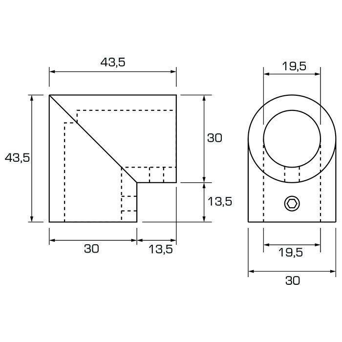 Hoekverbinder 90°, te gebruiken i.c.m. 21S1 of 21S2 (19mm buis).