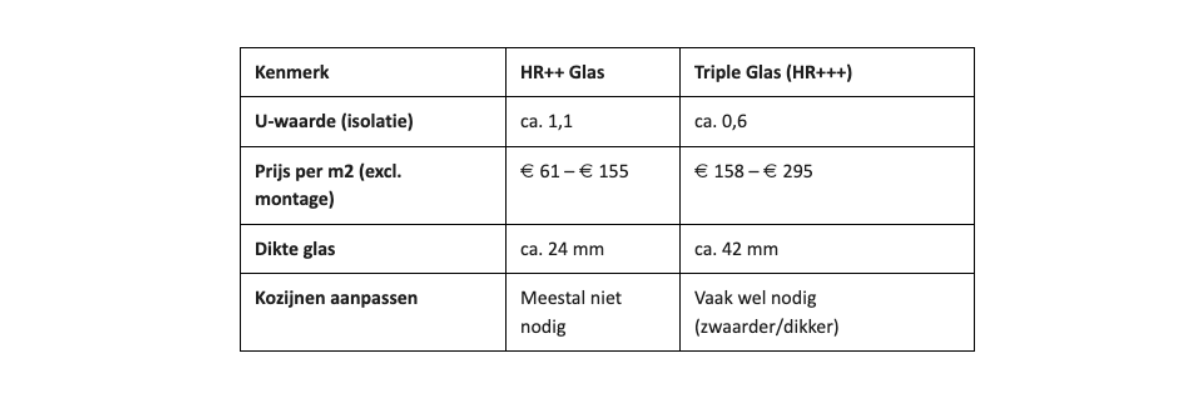 Een veelgestelde vraag is hoe HR++ glas zich verhoudt tot driedubbele beglazing (triple glas). Hoewel Triple glas HR+++ nog beter isoleert, liggen de kosten voor Triple glas ook 30 tot 50% hoger. Bovendien is Triple glas aanzienlijk zwaarder en dikker, waardoor het vaak niet in bestaande houten of smalle raamprofielen past. In dat geval moeten ook de volledige ramen (het schrijnwerk) vervangen worden.
