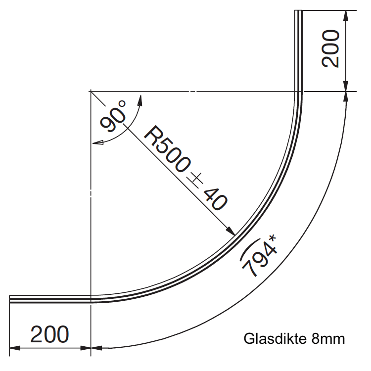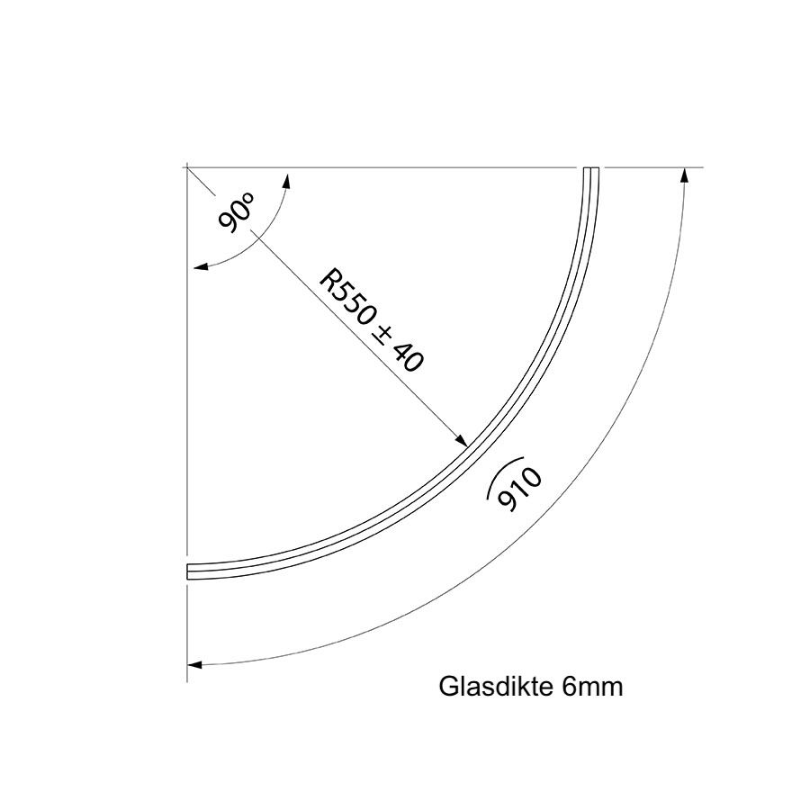 Belangrijk: De standaard radius van deze kwartronde douchestrip is R=500mm of R=550mm met een speling van ±40mm (Zie technische tekening).