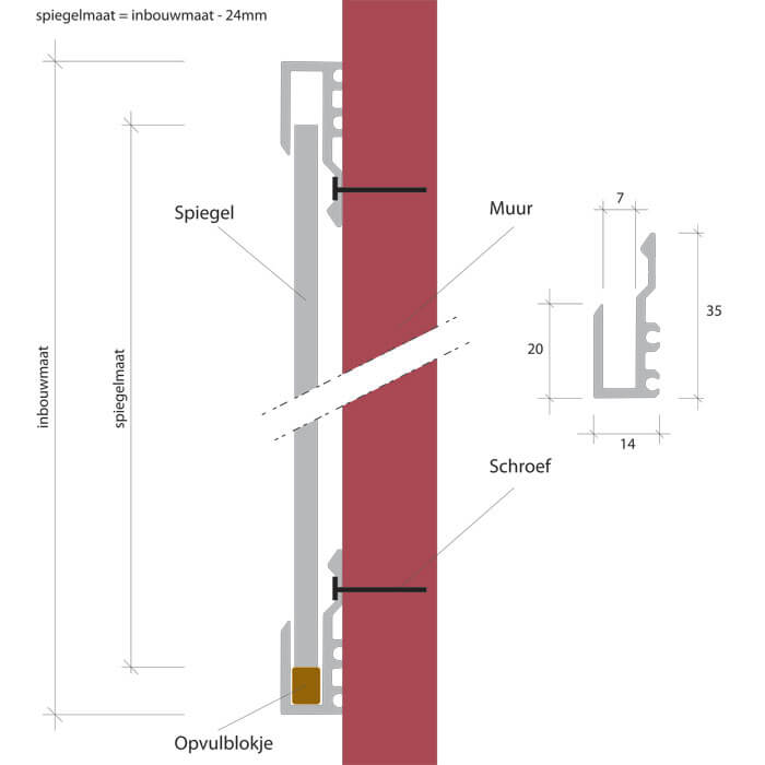 Let op: Bij grote spiegels vanaf 1800mm kan de spiegel in het midden bol gaan staan waardoor het spiegelbeeld kan gaan vervormen. Door in het midden een houten latje te plaatsen met bijvoorbeeld spiegeltape kan de spiegel op zijn plaats worden gehouden.