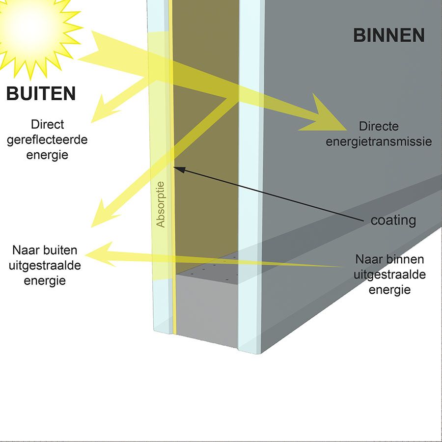 Bestel eenvoudig en snel uw Klima500 zonwerend ZHR++ dubbelglas. Dit warmtewerende glas is voorzien van een speciale zonwerende coating op de buitenruit en een HR++ coating op de binnenruit.